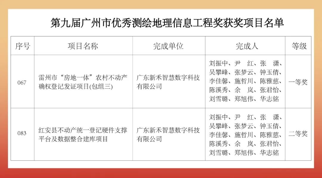 9月10日,广州市测绘地理信息协会发布第九届广州市优秀测绘地理信息工程奖评选结果公示。新禾智慧承建的“雷州市‘房地一体’农村不动产确权登记发证项目”获一等奖,“红安县不动产统一登记硬件支撑及数据整合建库项目”获二等奖。